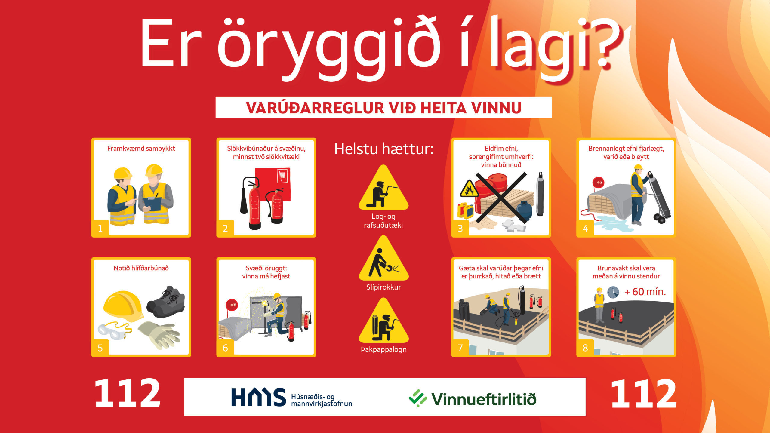 HMS og Vinnueftirlitið hafa gefið út veggspjöld með varúðarráðstöfunum við heita vinnu (PDF) á íslensku, ensku og pólsku.